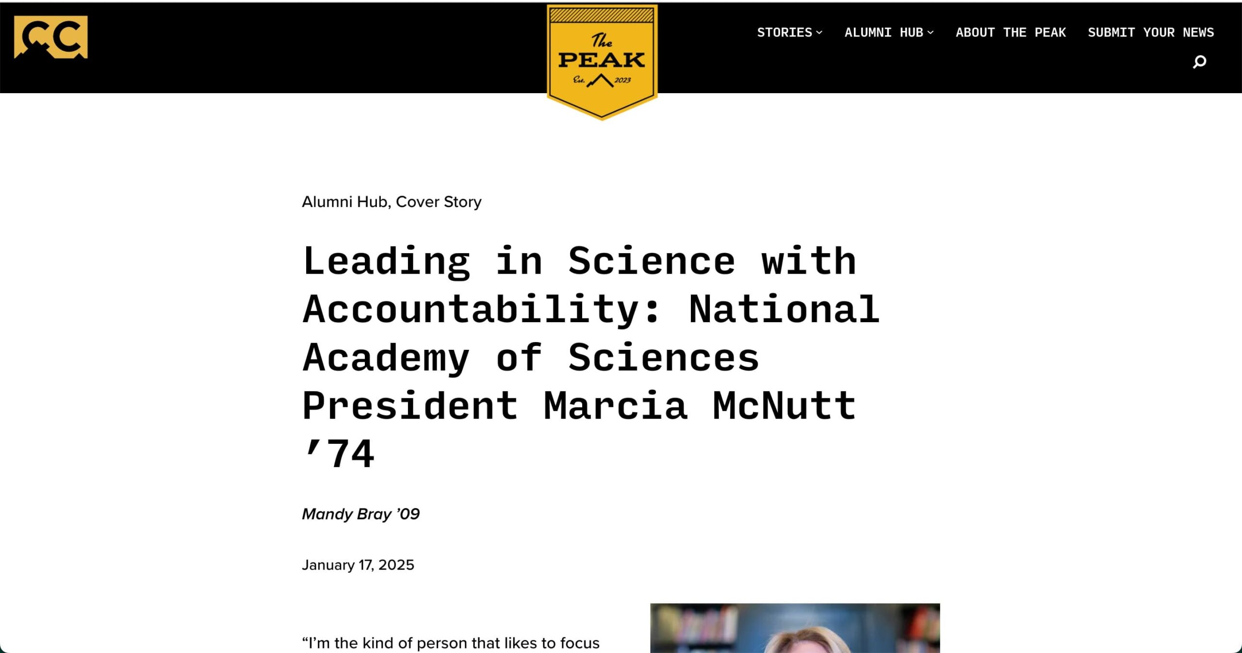 In 2024, Colorado College commissioned me to interview 10 of its most notable living alumni to commemorate its 150th anniversary. Among those was National Academy of Sciences President Marcia McNutt, whom I interviewed about her glass ceiling-shattering career in science.